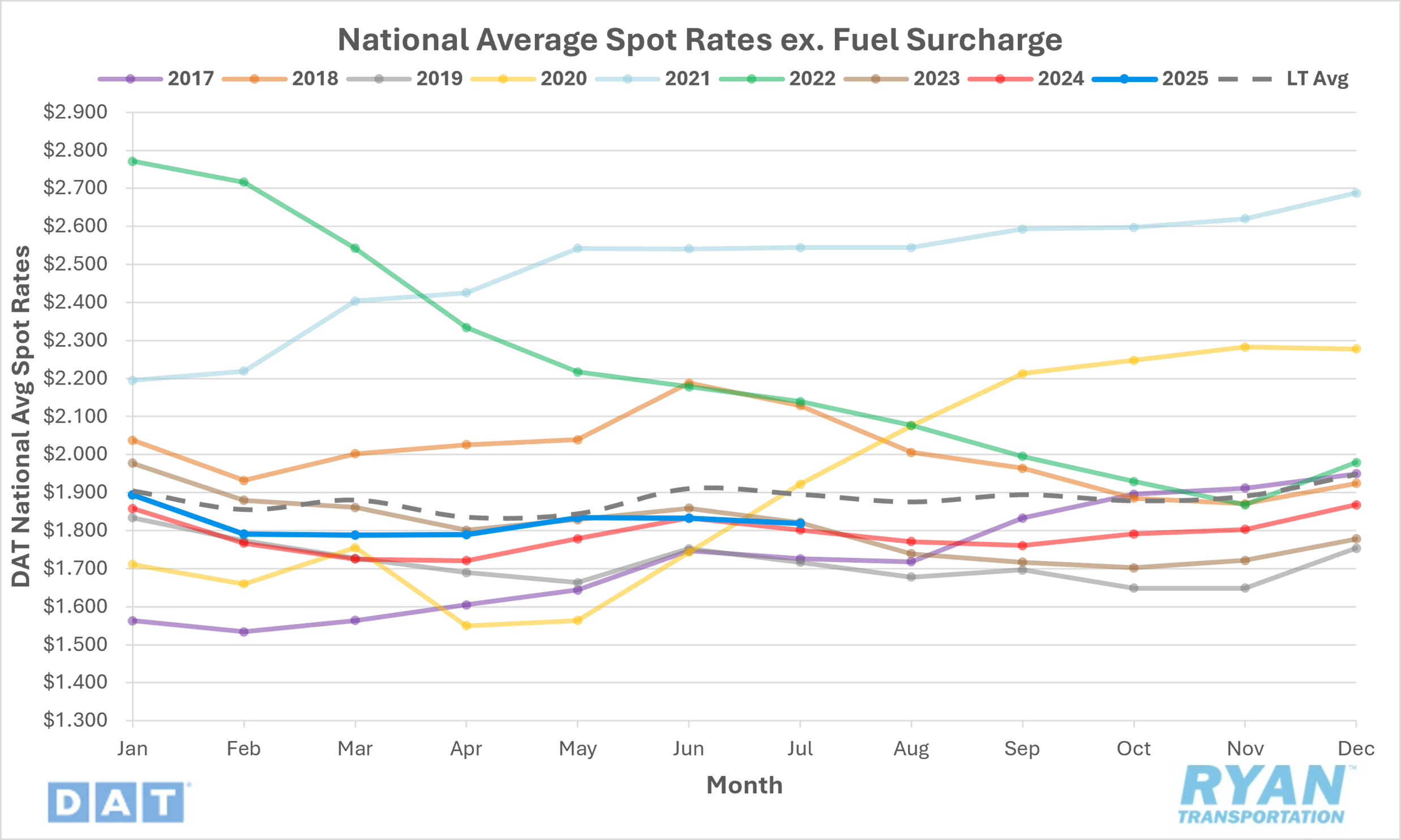 The national average spot rate, excluding fuel, declined 0.7% MoM, or just over $0.01, to $1.82 in July.