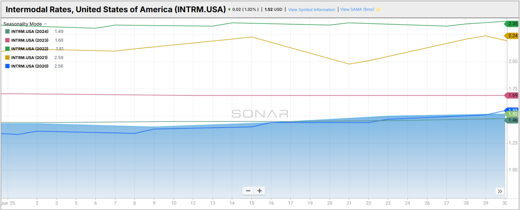 The FreightWaves SONAR Intermodal Rates Index (INTRM.USA), which measures the average weekly all-in door-to-door spot rate for 53’ dry vans across most origin-destination pairings, jumped in June to $1.52 (by $0.09, or 6.3% MoM).