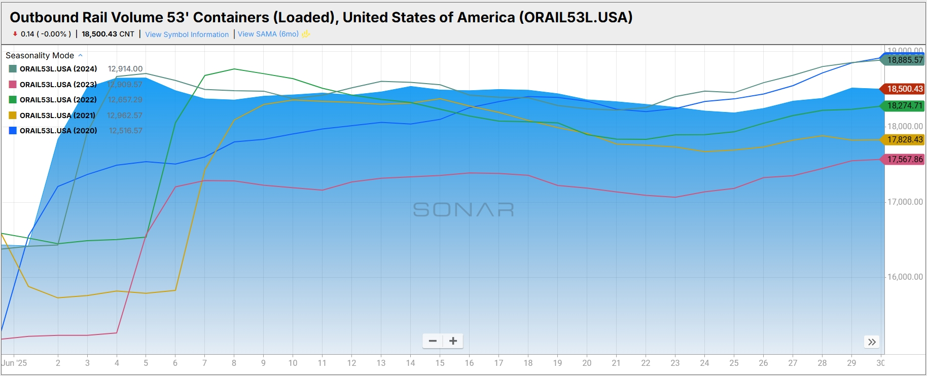 Total loaded volumes for 53’ containers for all domestic markets, measured by the FreightWaves SONAR Loaded Outbound Rail Volume Index (ORAIL53L.USA), increased 12.6% MoM, rising from 16,433.57 at the end of May to 18,500.57 in June.