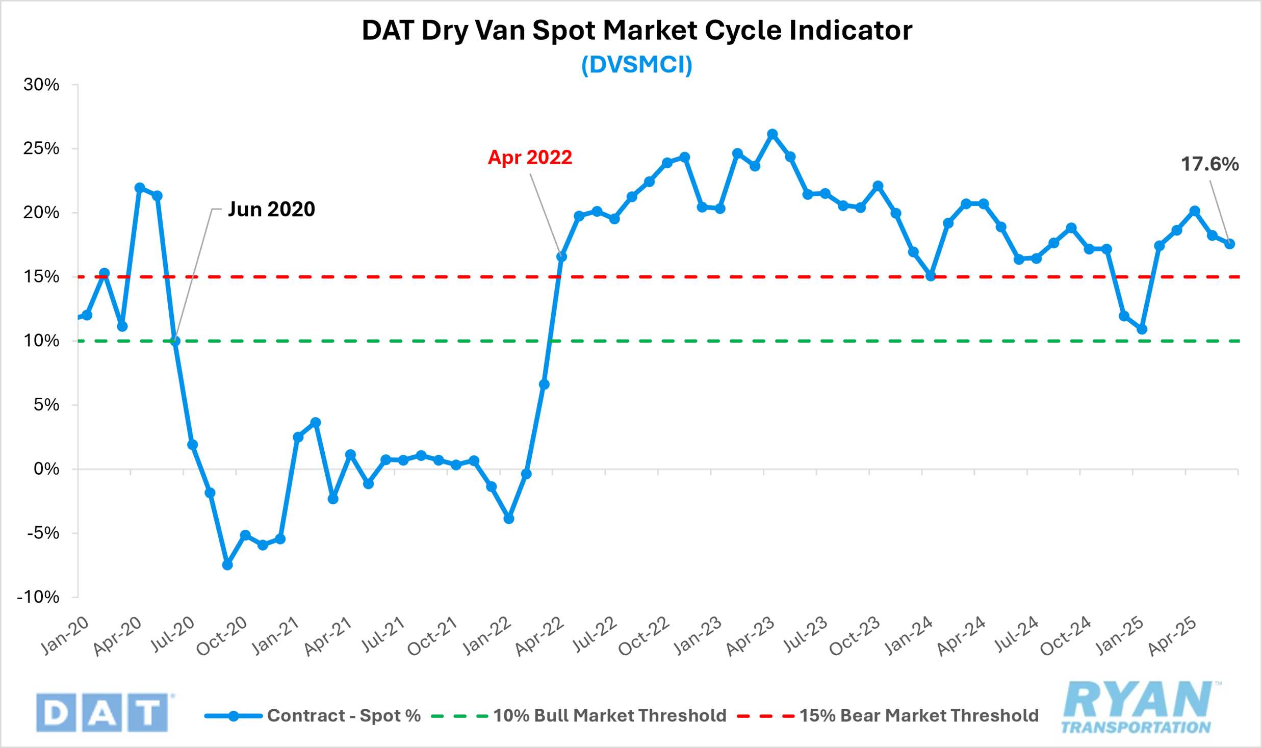 Another encouraging data point came from the DAT Dry Van Spot Market Cycle Indicator (DVSMCI), which tracks the spread between spot and contract rates relative to historical averages. The index declined from 18.3% in May to 17.6% in June. While this movement is modest and the indicator remains firmly in bearish territory, it represents progress. According to Dr. Jason Miller, Eli Broad Endowed Professor of Supply Chain at Michigan State University and developer of the index, sustained readings above 15% are consistent with bearish market conditions, while levels below 10% are generally indicative of a more bullish environment.