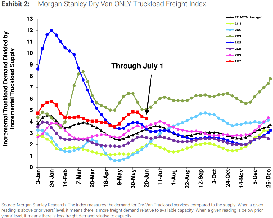 The Morgan Stanley Truckload Freight Index (MSTLFI) declined sequentially throughout June and underperformed typical seasonality, driven by strong underperformances in both supply and demand.