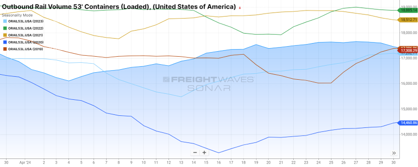 - Total loaded volumes for 53’ containers from all domestic markets, measured by the FreightWaves SONAR Loaded Outbound Rail Volume Index (ORAIL53L.USA), were up 2.4% at the end of April from where they closed out March.