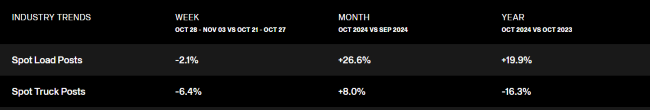 While the weakening demand observed in October aligns with seasonal expectations, the stability in volumes seen through much of the year appears to be softening. Following a Labor Day peak, volumes have trended downward over the past two months. Freight demand remains elevated compared to last year, suggesting that the market has likely reached its floor. However, the momentum that previously sustained volume resilience is showing signs of stalling. This sentiment has been echoed across earnings calls from major publicly traded trucking companies, with CEOs noting fewer shipments from customers and expressing limited optimism for a sharp recovery given the softer demand environment.